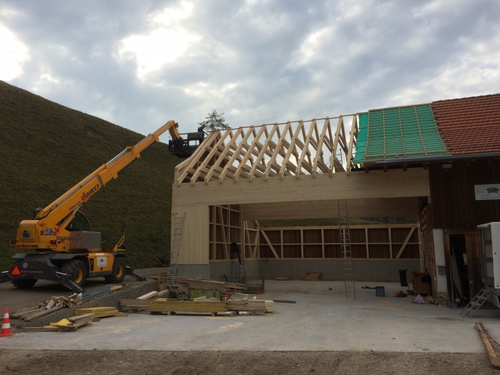 Ende 2015 erfolgte der Neubau unserer Abbundhalle. Die Erweiterung unserer Arbeitsfläche um mehr als das Doppelte stellt eine grosse Verbesserung unserer Arbeitsbedingungen dar.